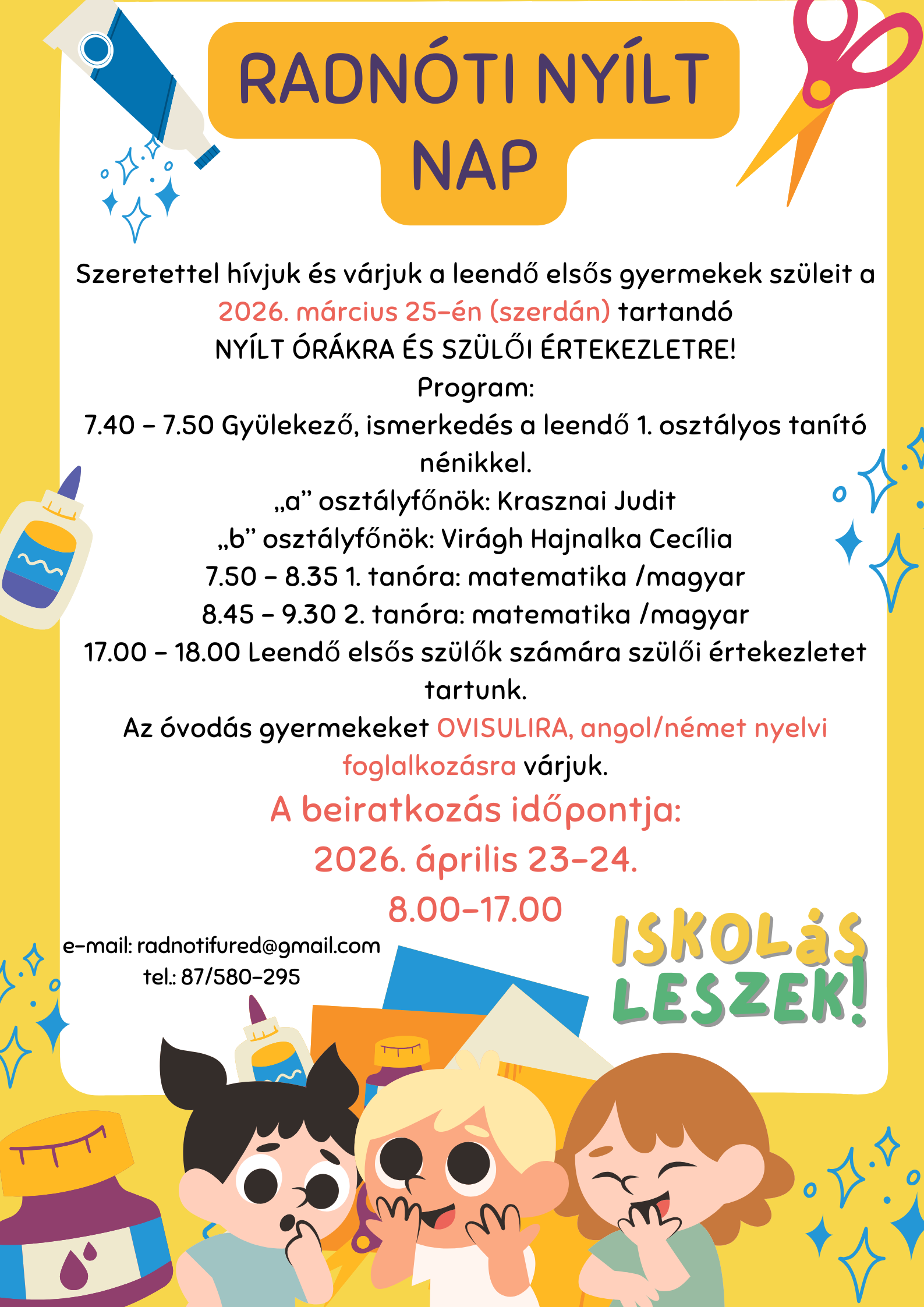 Szeretettel hívjuk és várjuk a leendő elsős gyermekek szüleit a 2026.március.25-én(szerdán) tartandó